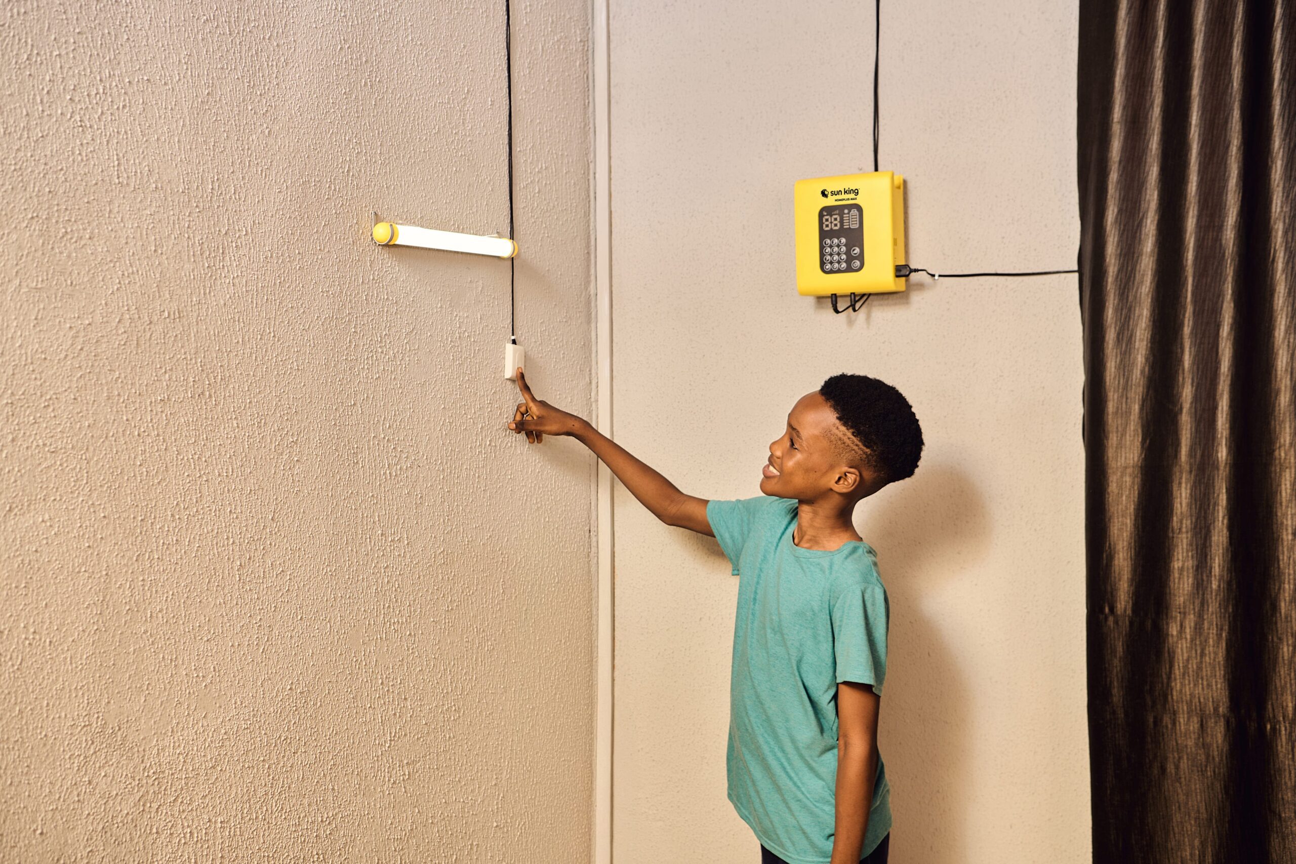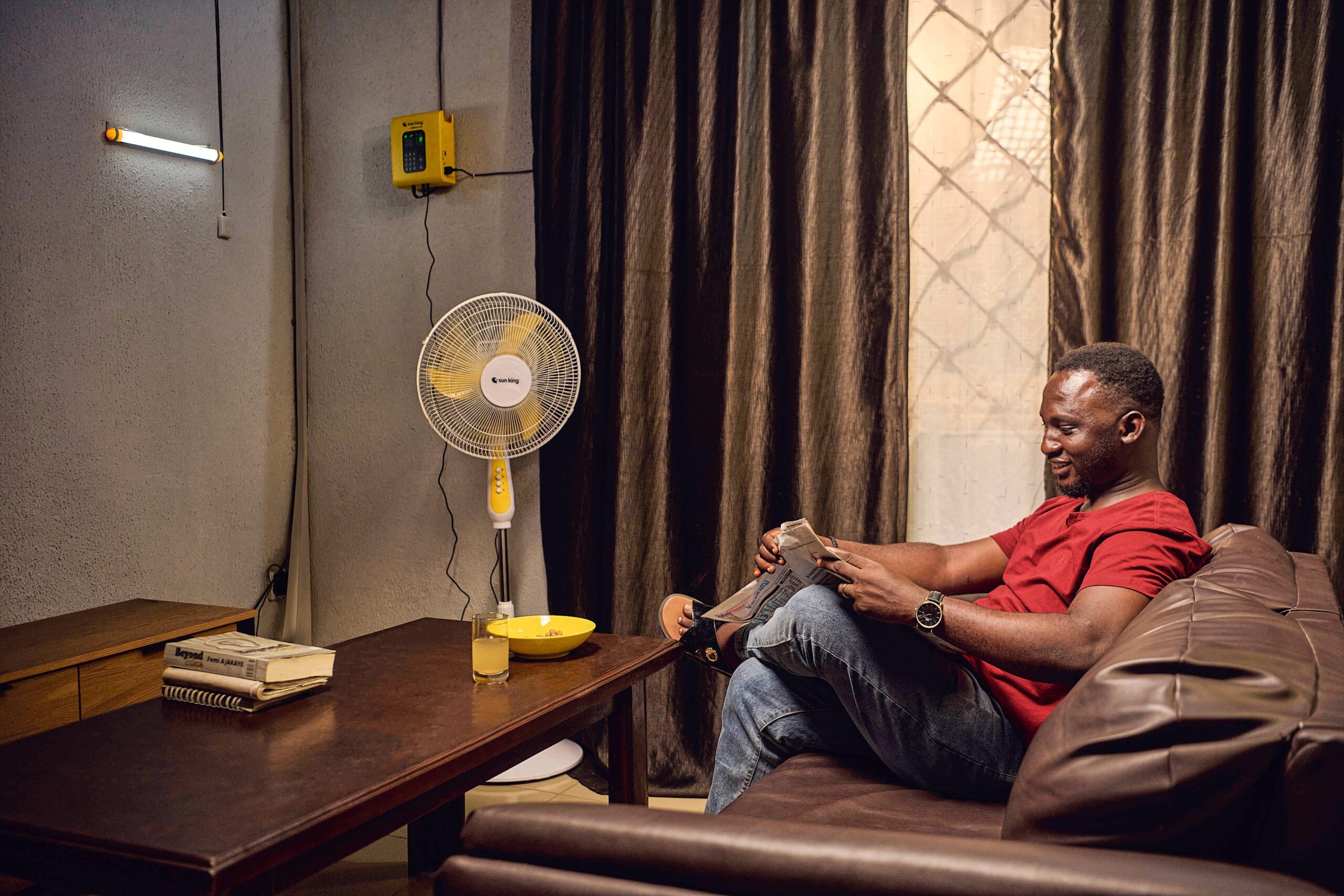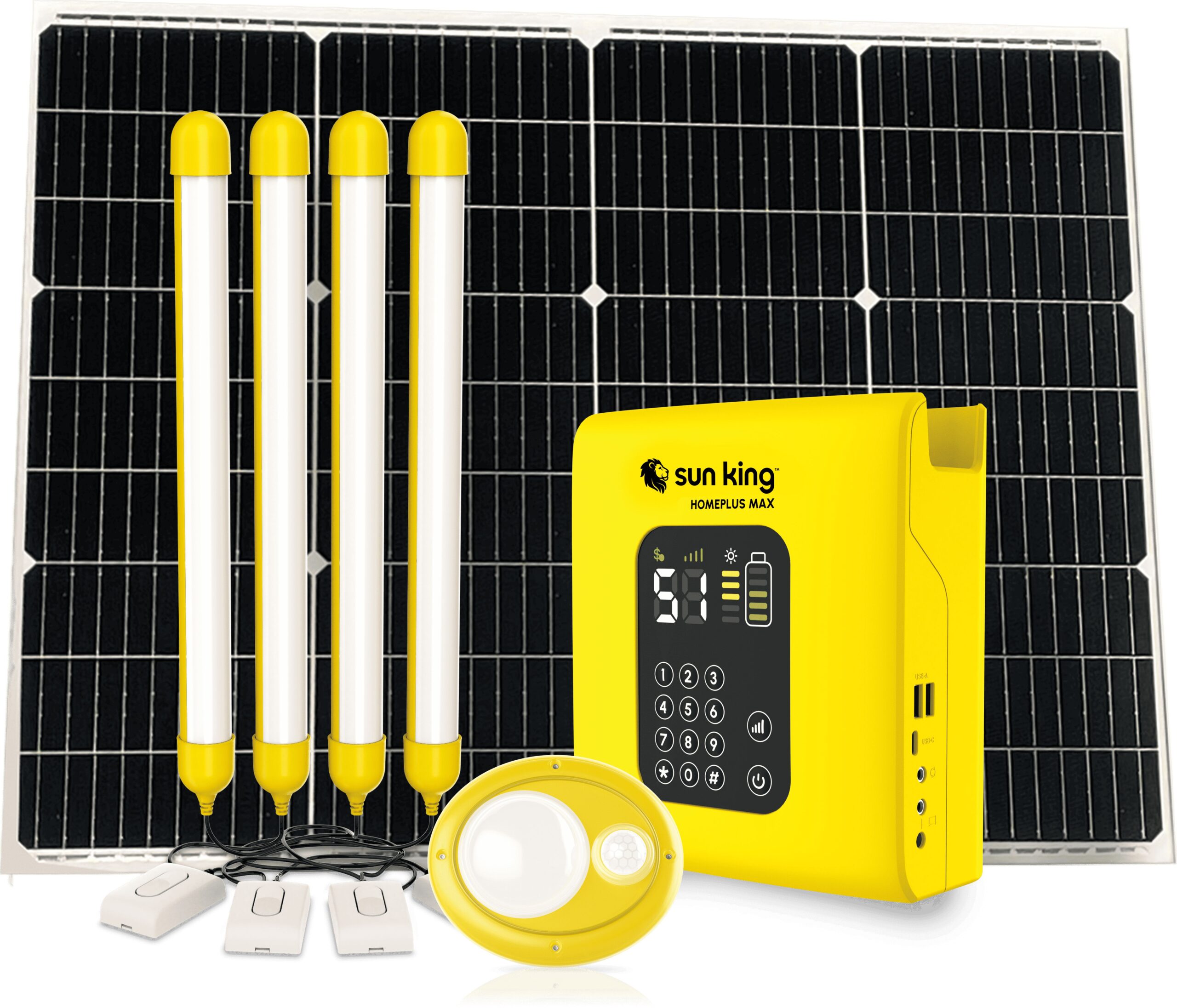 The HomePlus Max is Sun King’s most powerful solar home system. It provides lighting as bright as a modern, grid-powered home, and can power a range of devices and appliances simultaneously, including the Sun King pedestal fan and HD TV.